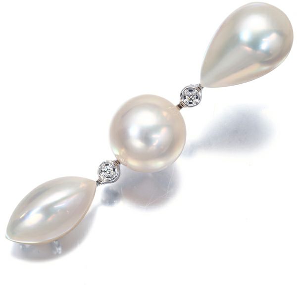 美しいテリ艶と光沢、浮かぶ深い干渉色が華やかな3珠のマベ真珠。間には上質ダイヤモンドの瑞々しい煌めきを飾っています。付け方を変えても楽しめるTASAKIの2WAYジュエリーですよ。