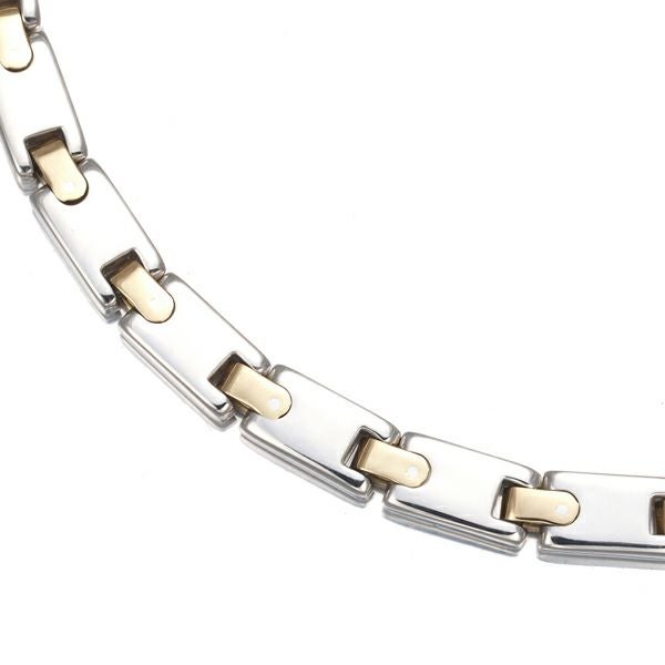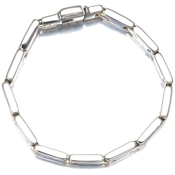 重厚なシルバーのスクエアな輝きの連結に上品なゴールドカラーのアクセントを飾ったティファニーのブレスレットです。