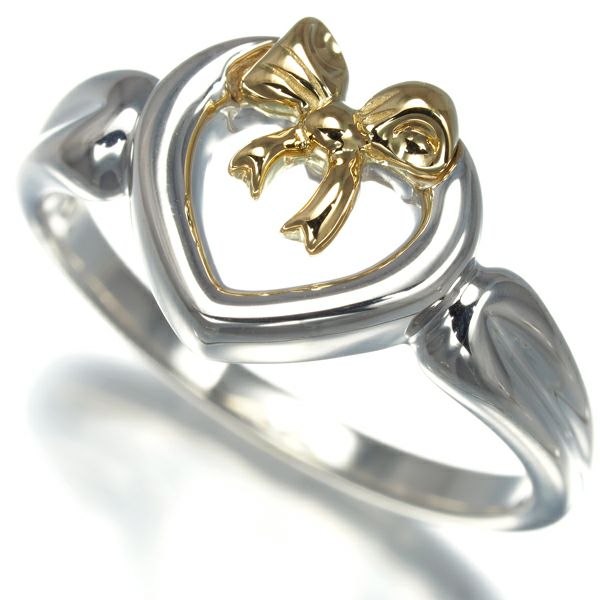 シルバーで描かれた艶やかなハートモチーフへゴールドリボンの上品なアクセントを飾ったティファニーのリングです。