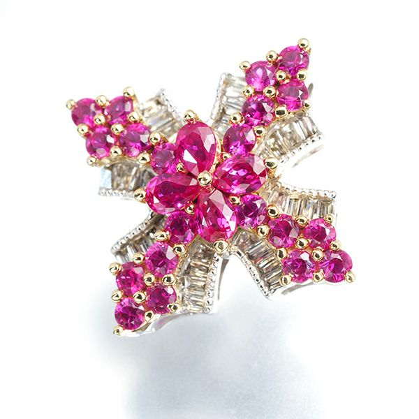 思わず目を引くルビーの鮮やかな輝きで描いたフラワークロスには 仄かなライトブラウンの煌めきがシックなニュアンスを醸し出すテーパーカットダイヤモンドを。立体的なデザインとともに 装いを印象的に彩るジュエリーです。