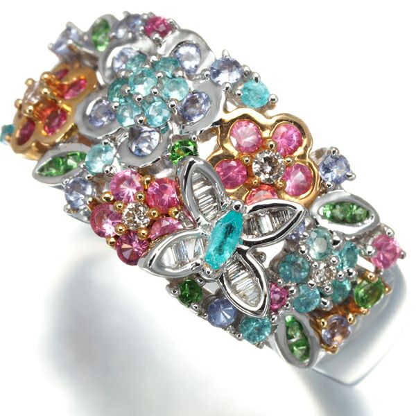 瑞々しい潤いから 彩り豊かな煌めきを魅せるフラワージュエリー。パライバトルマリンやタンザナイトの稀少宝石に、上質ダイヤモンドの透明感溢れる輝きを散りばめた とても華やかな一品。立体的なシルエットに繊細に飾られた宝石達が 装いをより美しく輝かせます。
