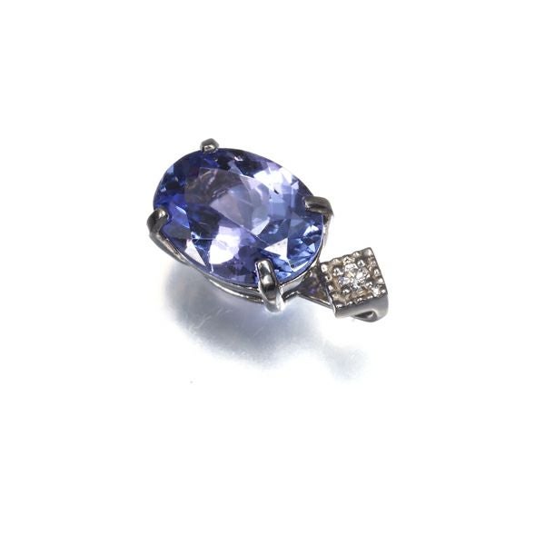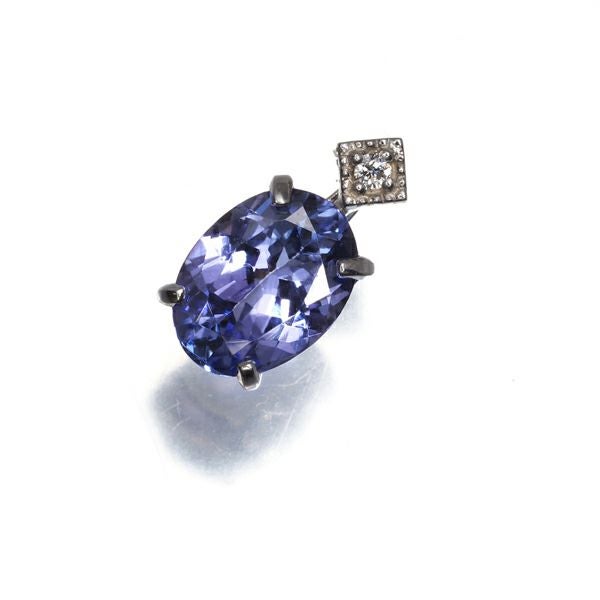 妖艶なラベンダーブルーの瑞々しい輝き美しいタンザナイト。上部で煌めくメレダイヤと共に胸元を上品に演出してくれます。