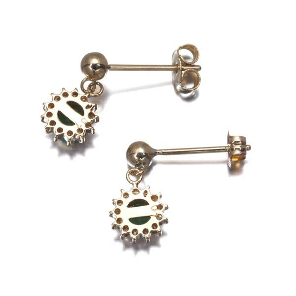 エメラルドの上品な彩と取り巻きでキラキラとダイヤ煌めくデザインが繊細に揺れるピアスです。