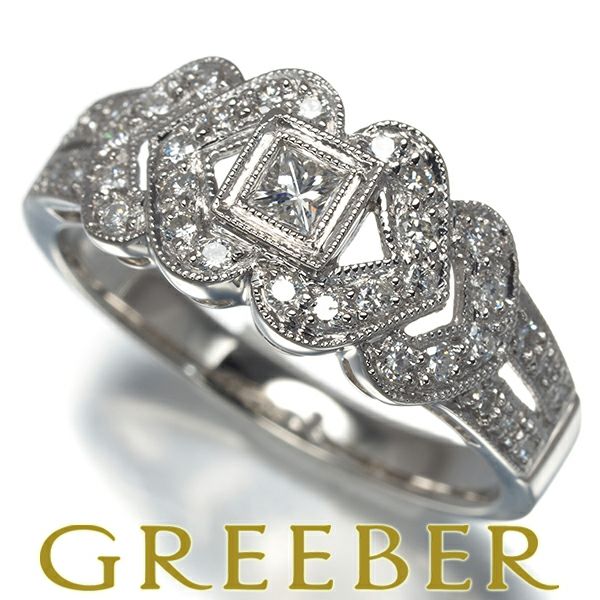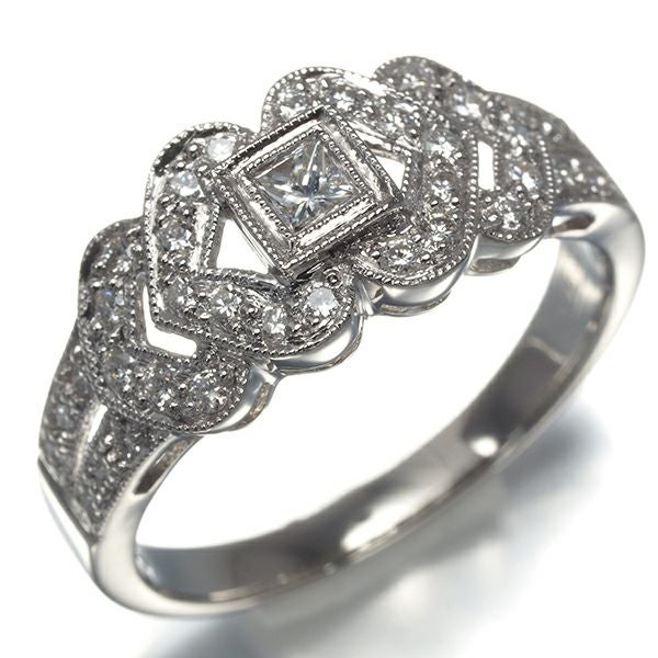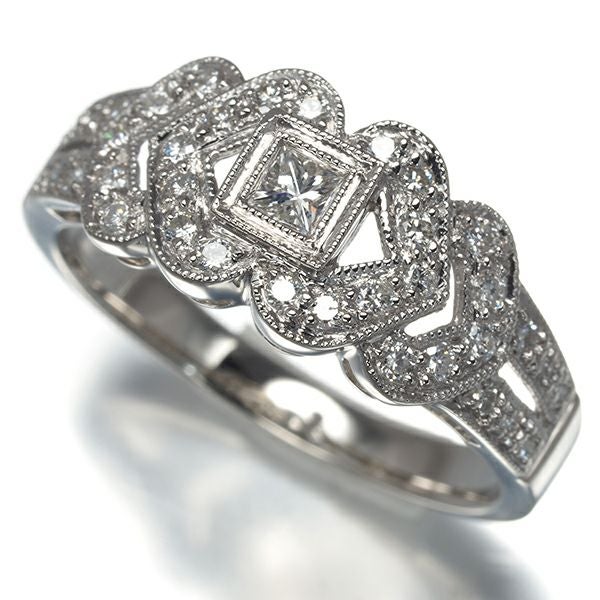 繊細なミルグレイン細工の優雅なデザインをあしらったダイヤモンドリング。メインにはプリンセス、取り巻きにはラウンドをあしらった瑞々しく繊細な輝きがデザインを一層引き立てております。
