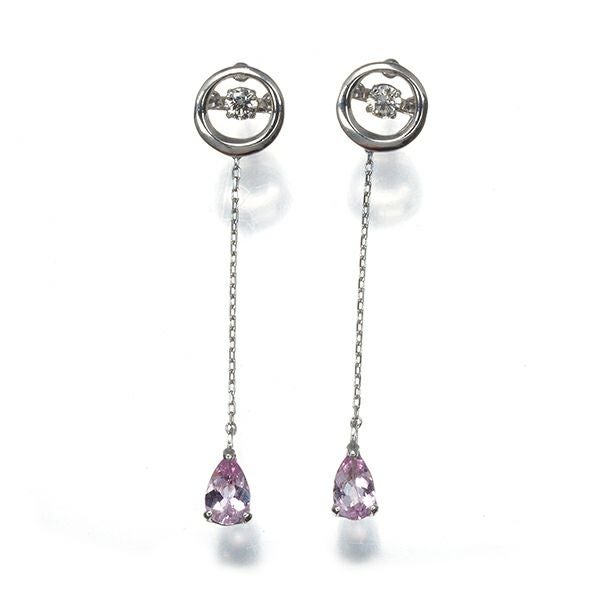 細やかな動きを魅せるダンシングストーンデザインに飾られたダイヤモンドの眩い輝きに ヌーディに飾られたティアドロップのモルガナイトが揺れ煌めく素敵なピアスです。
