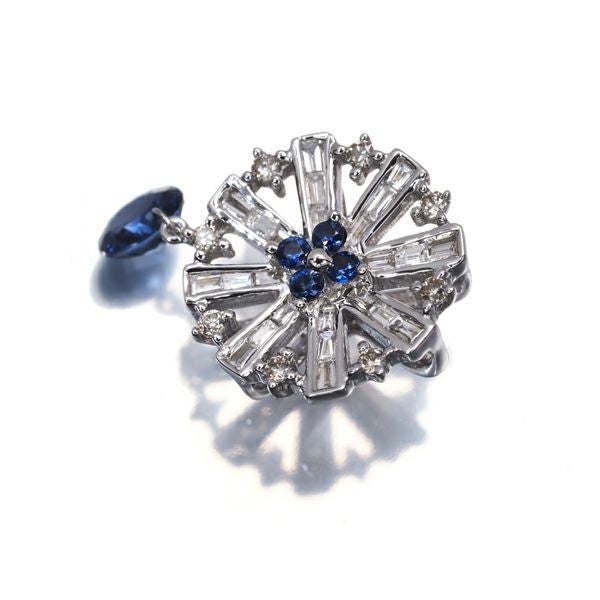 2種カットダイヤの輝きで描かれたフラワーを思わせるデザインに 色美しいサファイアが揺れ煌めく素敵なペンダントトップ。装いの胸元にエレガントなニュアンスをお楽しみください。