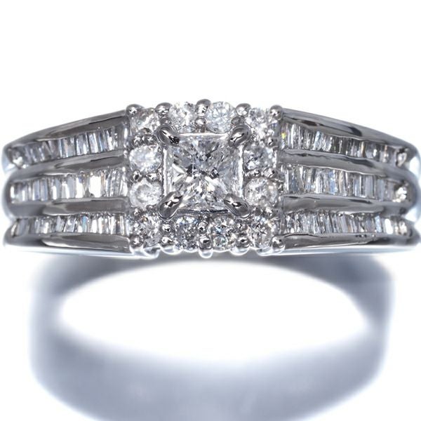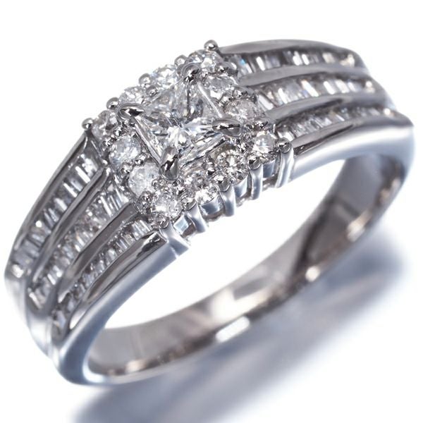 3種カットの表情で魅せる輝きが贅沢なダイヤモンドリング。内包物は見られるもののお手元では感じさせない艶やかなテリから上品な輝きを放つプリンセスカットダイヤをメインに飾った どこかクラシカルな印象の一品です。