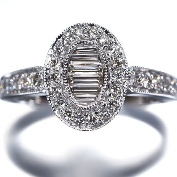 素晴らしい透明感から清らかな輝きを放つバゲットカットをメインにラウンドメレの瑞々しい煌めきで包み込んだダイヤモンドリング。どこかクラシカルなニュアンスとともに お手元を美しく飾ってくれますよ。