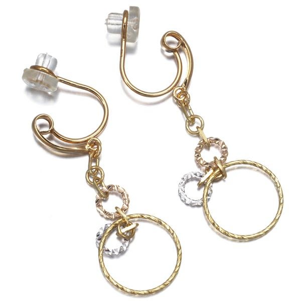 スリーカラーのサークルが耳元でエレガントな輝きを演出するイヤリングジュエリーを是非いかがでしょうか。