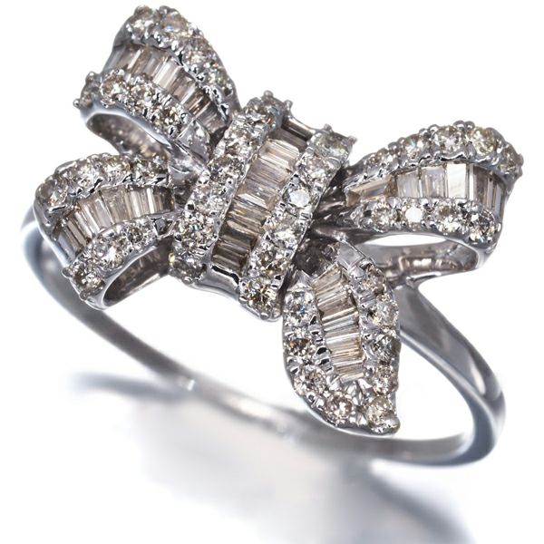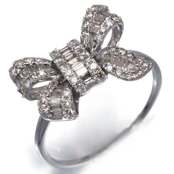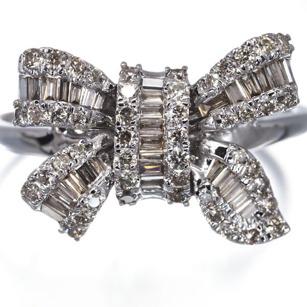 内包物の少ない上質な2種カットのブラウンダイヤモンドを飾ったリボンデザインのリングジュエリーです。煌めき溢れるダイヤモンドとフェミニンなリボンデザインが指元にアクセントを与えてくれますよ。