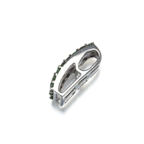 鮮やかなグリーンガーネットの輝きをパヴェに飾ったシンプルなデザイン。爪留め部分にはグリーンを引き立たせるようブラックコーティングをあしらっております。