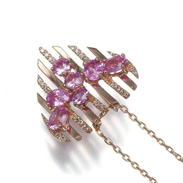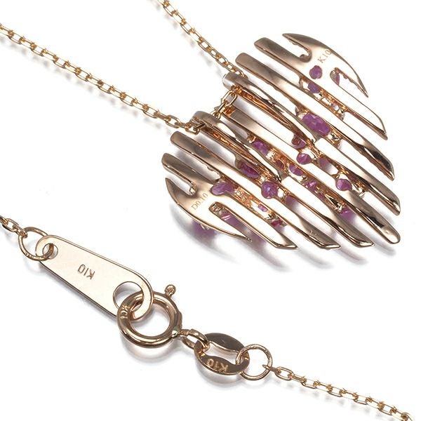 艶やかなピンクゴールドの光沢とメレダイヤ煌めく9本のラインでハートモチーフを演出したネックレス。共に輝く彩美しいピンクサファイアの輝きと共に胸元をフェミニンに照らしてくれるジュエリーです。