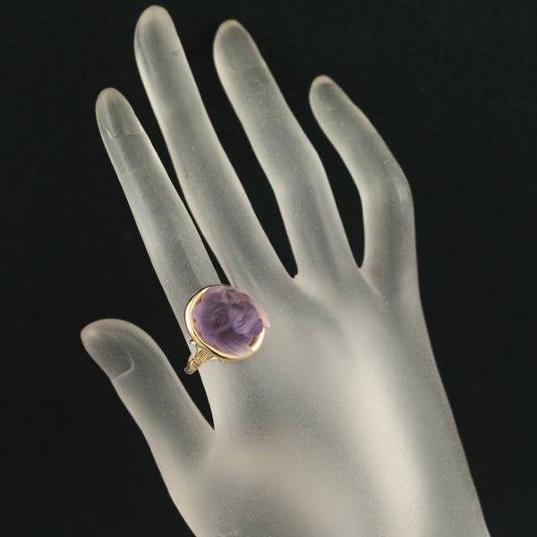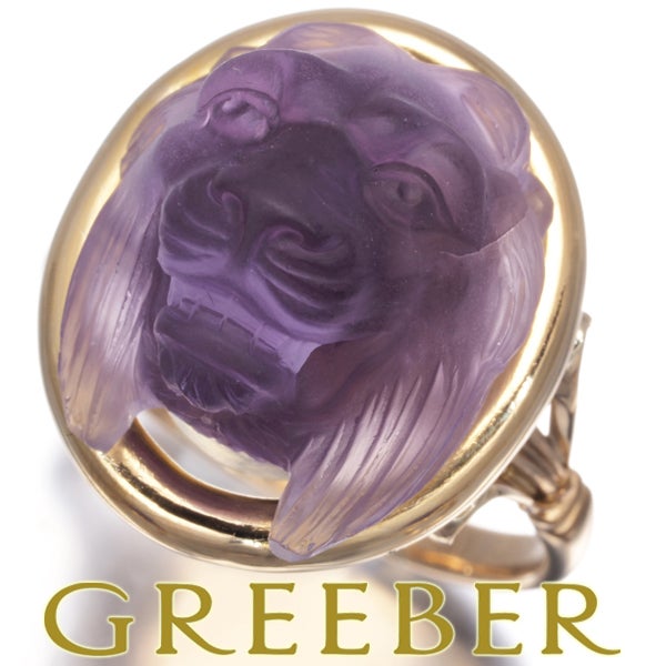 フロスト加工されたアメジストへライオンのカーヴィングを立体的に演出した素晴らしい1石をゴールドリングへ飾ったお品です。
