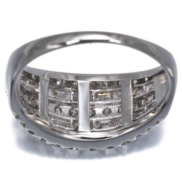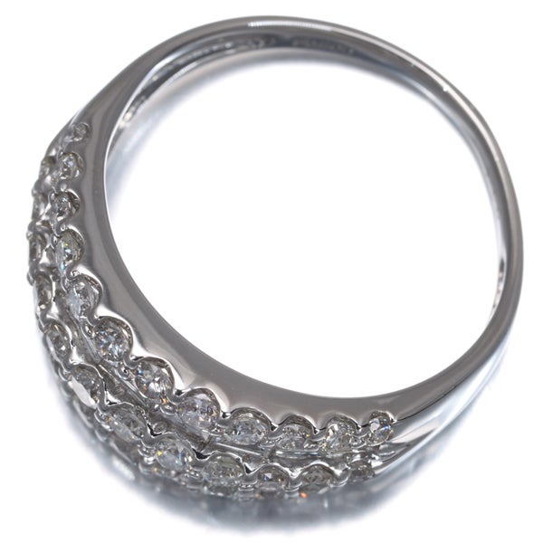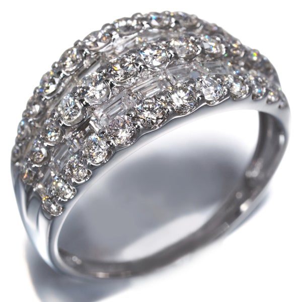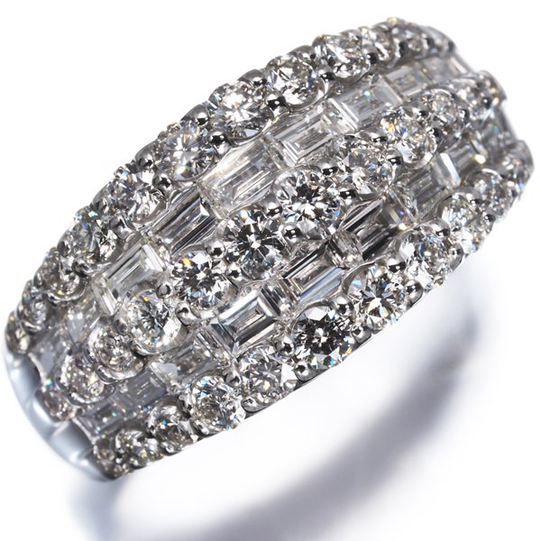 ボリュームある造りへ5連にダイヤモンドの輝きを演出したリング。上質な透明感を持つラウンド&バゲットカットの輝くコントラストがお手元を華やかかつ上品に照らしてくれることでしょうね。