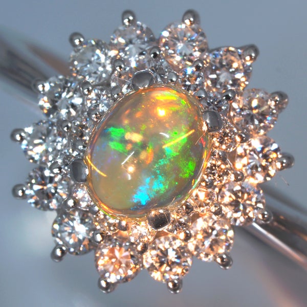 上質ダイヤモンドの煌びやかな輝きに包まれたオパールは柔らかにオレンジの色味を持ち潤いを持つような瑞々しさ溢れる透明感と艶やかな表情を披露する1石。角度によって見られる幻想的なプレイオブカラーの輝きと共にお手元にエレガンスを与えてくれますよ。