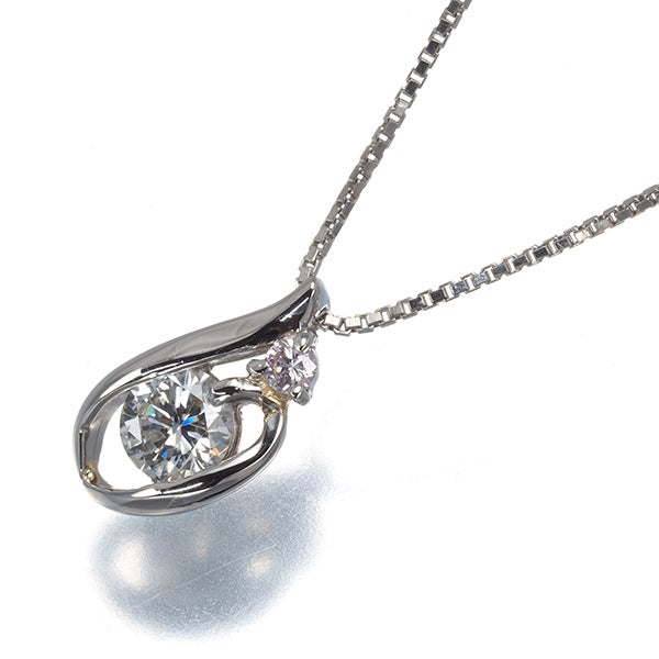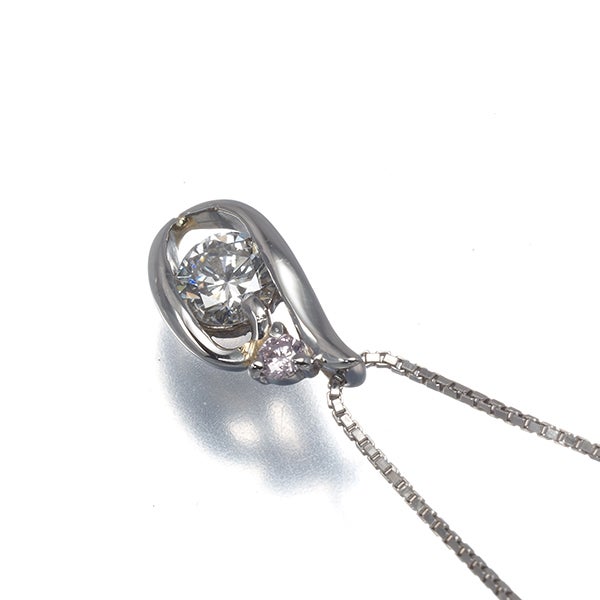 0.3ctアップの存在感あるダイヤモンドを主役にしたデザインネックレス。VSクラスアップと思われる上質な透明感を持つ石がセレクトされており、色味もほとんど感じない澄んだ輝きが印象的です。希少な天然カラーのピンクダイヤがやわらかな彩りを添え、胸元にさりげない華やかさを与えてくれますよ。