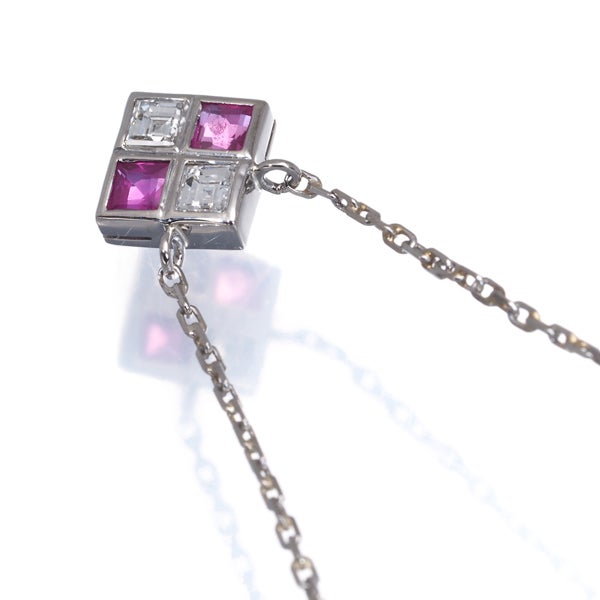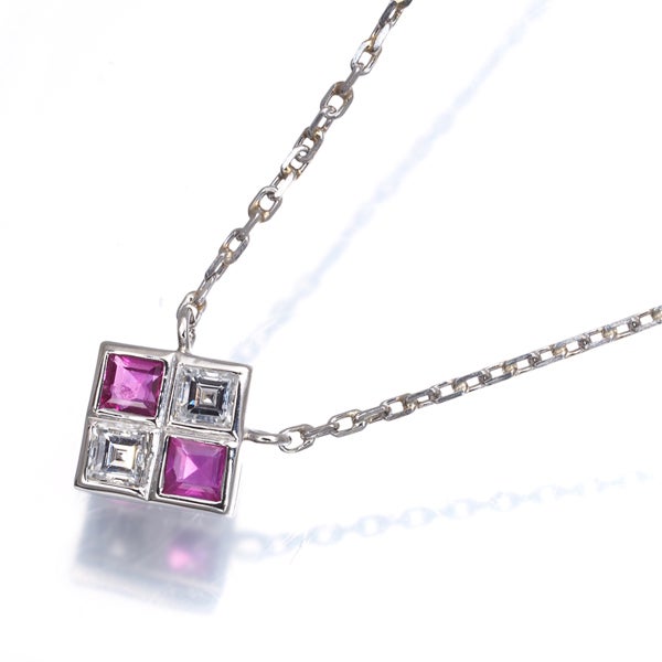 スッキリとした極上の透明感から鮮やかな煌めきを披露するスクエアカットのダイヤモンドと色鮮やかなルビーの彩が上品なコントラストを奏でるプラチナネックレスです。