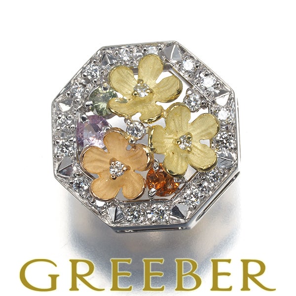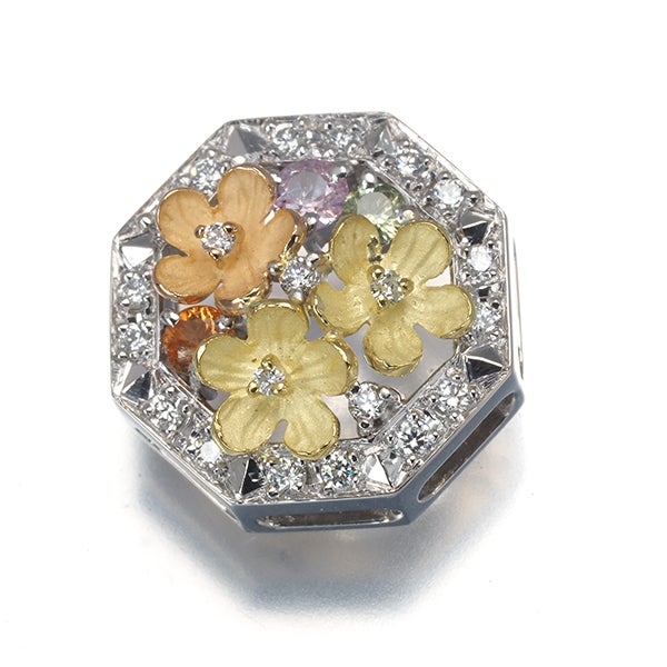 艶消しのテクスチャーで花びらの柔らかな質感を表現した細やかな作りが美しい一品。花露のように飾られた彩り豊かなサファイアと上質ダイヤモンドの瑞々しさが 胸元に上品な輝きを飾ってくれます。