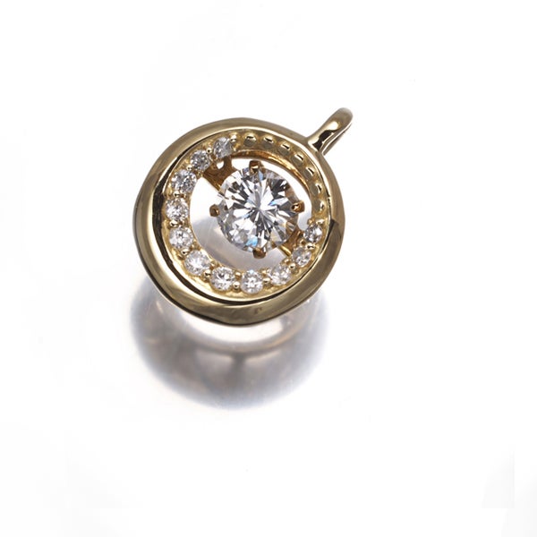 メレダイヤの煌めきを飾ったオープンサークル内へプルプルと繊細な揺れ煌めきを演出する0.20ctのダイヤモンドをセッティングしたダンシングストーンジュエリー。上質な透明感を持つ1石の眩く透明感溢れる煌めきが胸元を上品に照らしてくれますよ。