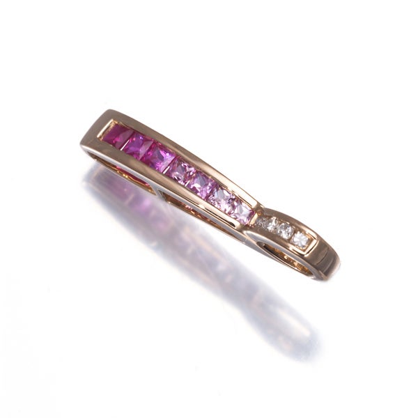 ルビー&ピンクサファイアの美しいカラーグラデーションをすっきりとしたバーデザインに飾った素敵なペンダントトップ。メレダイヤの瑞々しい煌めきとともに 装いの胸元を美しく彩ります。