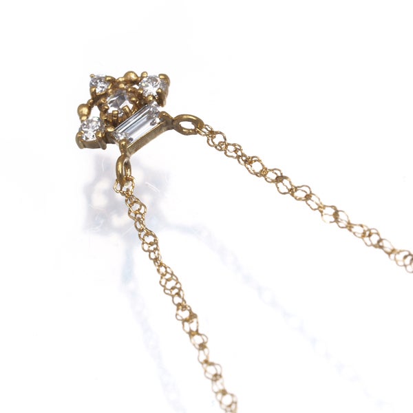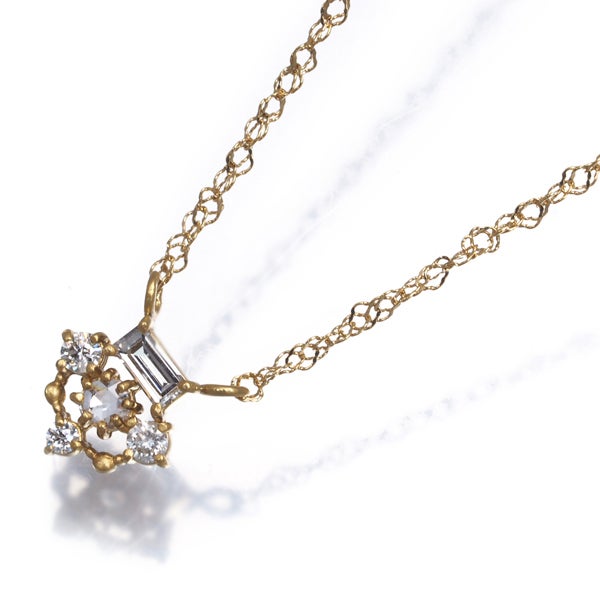 上質な透明感を持つバゲット、ラウンドそしてローズカットダイヤモンドの輝きを飾った眩くフェミニンな煌めき美しいネックレスですよ。