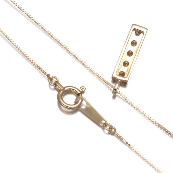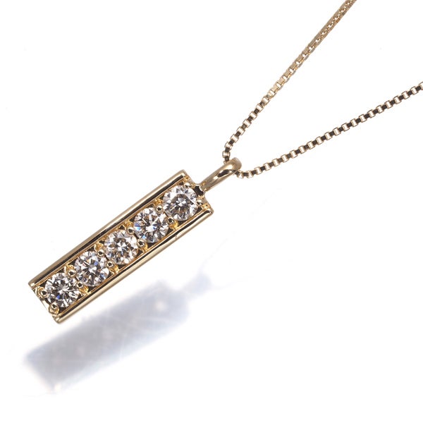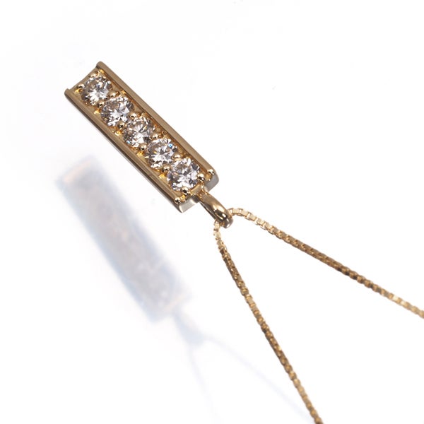 艶やかなゴールドフレーム内へ5石の上質ダイヤモンドを並べたシンプルなバーデザインネックレスですよ。