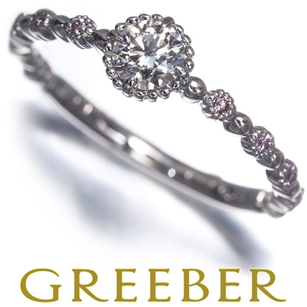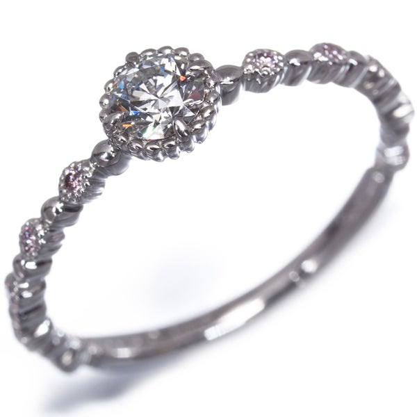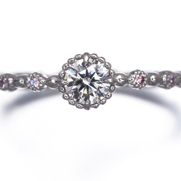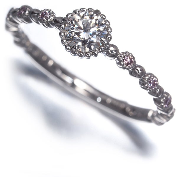 サイドには希少なピンクダイヤの繊細な煌めきを、メインには色味が感じられない素晴らしい透明感を持つ厳選ダイヤモンドを添えたリング。繊細かつ華奢なデザインにダイヤの美しい輝き映えるリングです。