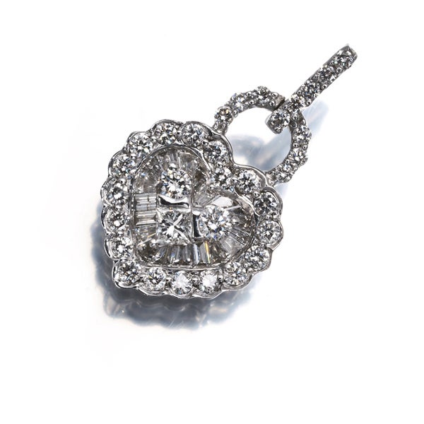 メインにプリンセスカットとラウンドメレの眩い輝きでハートモチーフを飾ったダイヤモンドジュエリー。周囲を縁取る煌めきやテーパーカットなど いずれも上質の透明感溢れる煌びやかな輝きを放つお石をセレクト。装いの胸元を上品な華やかさで飾ってくれます。