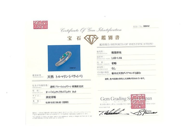 【スプリングキャンペーン!11%対象商品】 パライバトルマリン 0.09ct/0.02ct ダイヤ ダイヤモンド 0.03ct リング Pt950 鑑別書【中古】GENJ