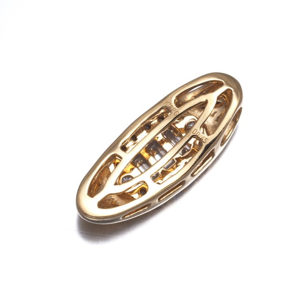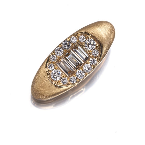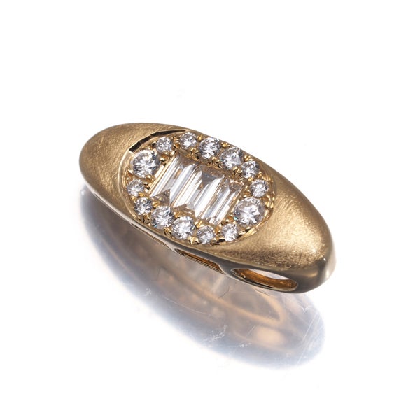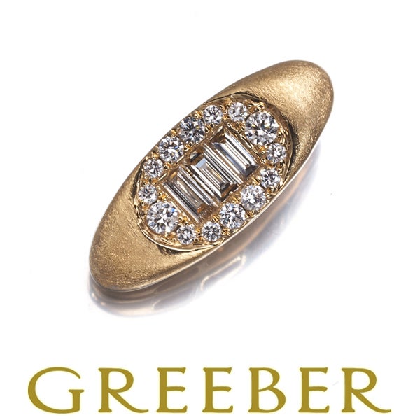 艶を抑えたゴールドの煌めきと共にラウンドメレダイヤの繊細な輝きをあしらったシンプルなデザイン。メインにはVSクラスアップのクラリティと思われる素晴らしい透明感を持つ3石のバゲットダイヤが鮮やかな煌めきを演出します。