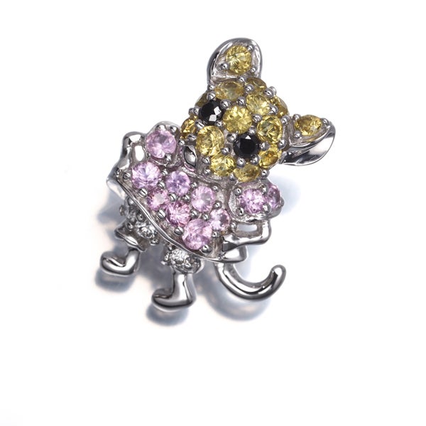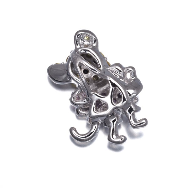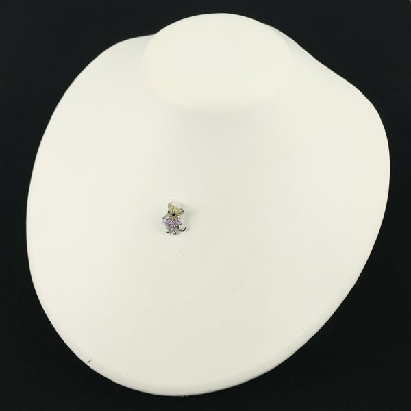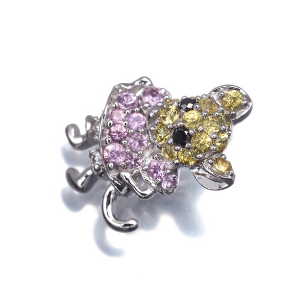 ブラックダイヤの瞳とイエロー&ピンクサファイアの可憐な彩を飾った愛らしいネズミのデザイン。キラキラと美しい輝きと素敵なデザインが胸元を演出しますよ。