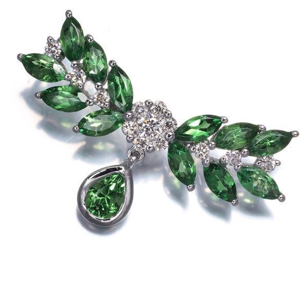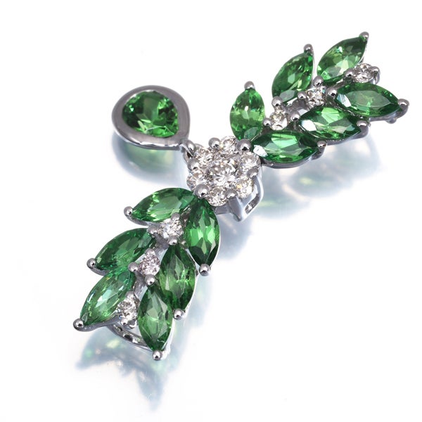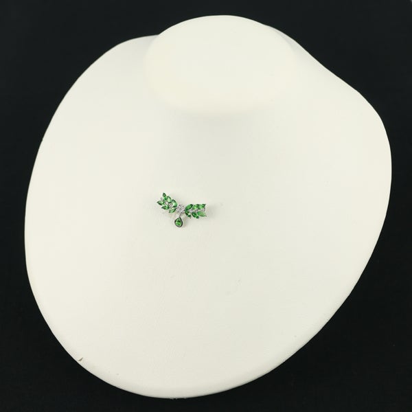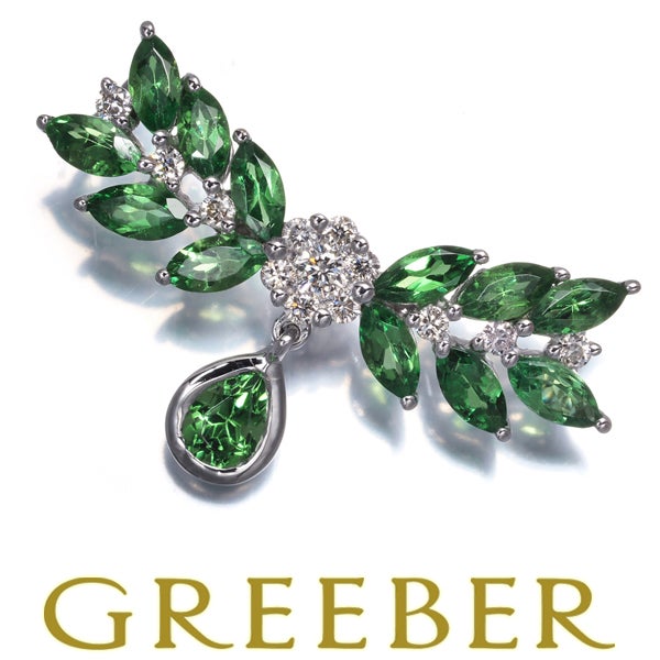 鮮やかなグリーンの彩りと艶やかな輝きが目を引くガーネットをリーフに飾った素敵なペンダントトップ。メインには透明感溢れる輝きを放つダイヤモンドフラワーが上品に飾られています。