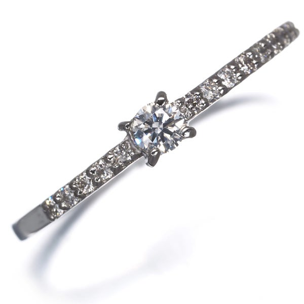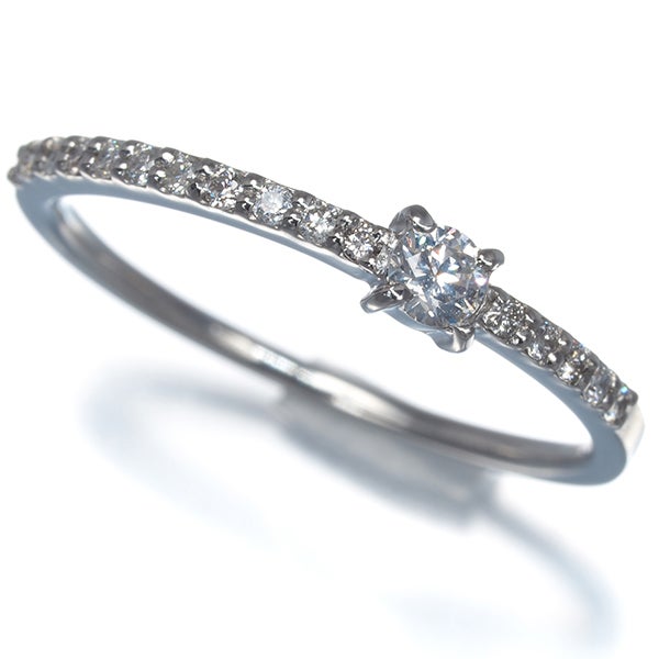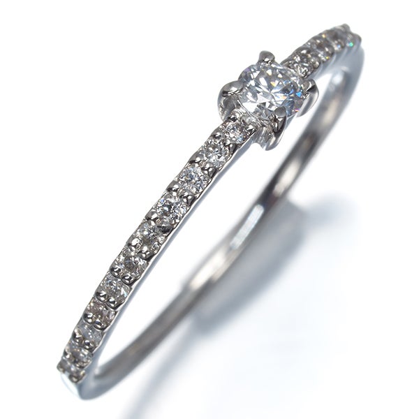 ダイヤモンドの煌めきがお手元を飾るリングジュエリー。中心を外れてメインダイヤを飾ったデザインは隣の指輪にダイヤが当たらない付け方や重ね付けにおすすめですよ。