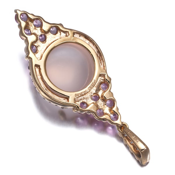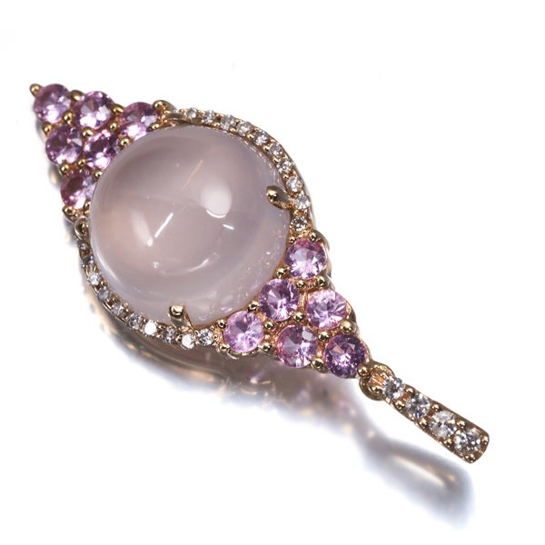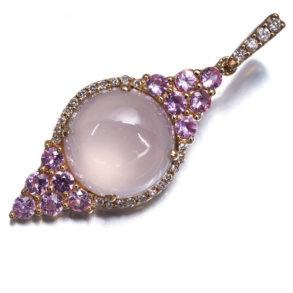 ボリュームあるローズクォーツの美しい輝きをピンクサファイアとメレダイヤが引き立たせるペンダントトップ。3種類の宝石が魅せるエレガントな輝きが胸元を飾ります。
