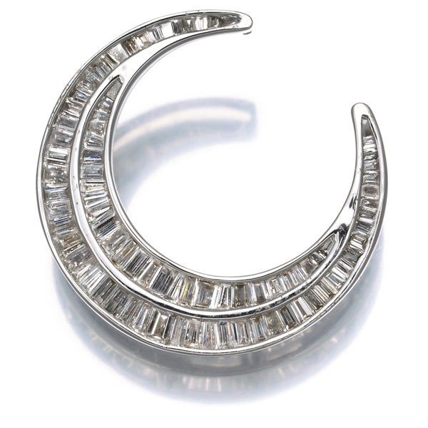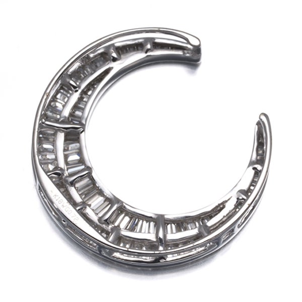 上質の透明感と艶やかなテリを持つテーパーカットダイヤモンドで三日月の輝きを描いた美しい一品。華やかかつ上品な煌めきが 装いの胸元を印象的に輝かせてくれます