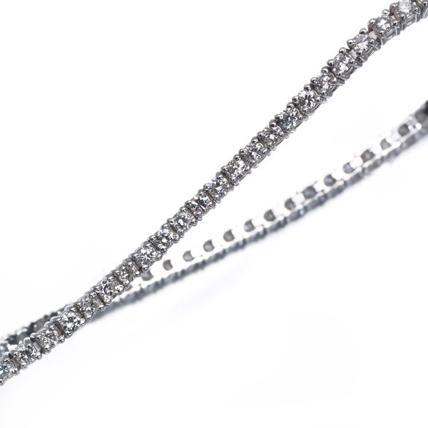 総計2カラットのダイヤモンドを使用したテニスブレスレット。多少の内包物が見られる石もございますが、腕元ではそれを感じさせないダイヤモンドならではのテリと瑞々しい煌めきがお手元に上品な印象を与えてくれます。ホワイトゴールドの光沢とともに、ダイヤモンドの溢れる輝きが装いを一層エレガントに演出してくれますよ。