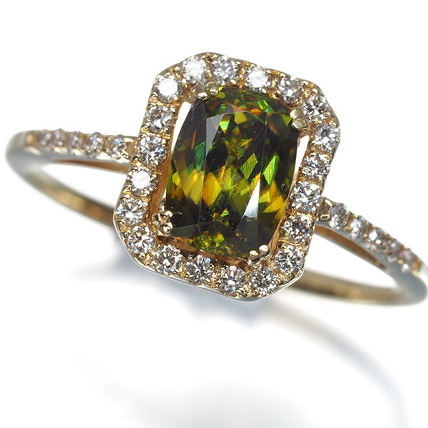 オリーブグリーンの彩りに眩い虹色のファイアを魅せる希少宝石スフェーンは 小振りながらも比較的内包物も少ない美しい1石。上質メレダイヤの瑞々しさを繊細に飾り 装いのお手元を美しく飾ってくれます。
