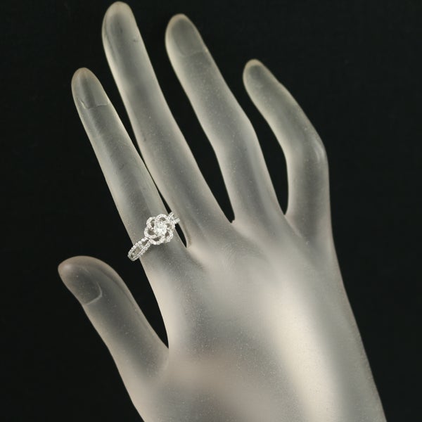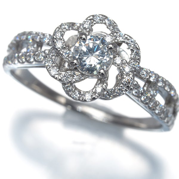 プラチナの上品な輝きにフラワーモチーフをあしらったデザインリング。センターストーンを囲むようにダイヤモンドが華やかに煌めき、立体感のある美しい仕上がりです。繊細で可憐なデザインと内包物の少ない上質ダイヤが、お手元に上品な華やかさを添えます。