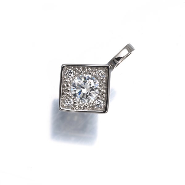 メインは0.337カラットのダイヤモンド。ほとんど色味を感じない上質な輝きを放ちます。周りにはさりげなくメレダイヤを飾り、端正なスクエアデザインに上品な煌めきを演出した一品です。