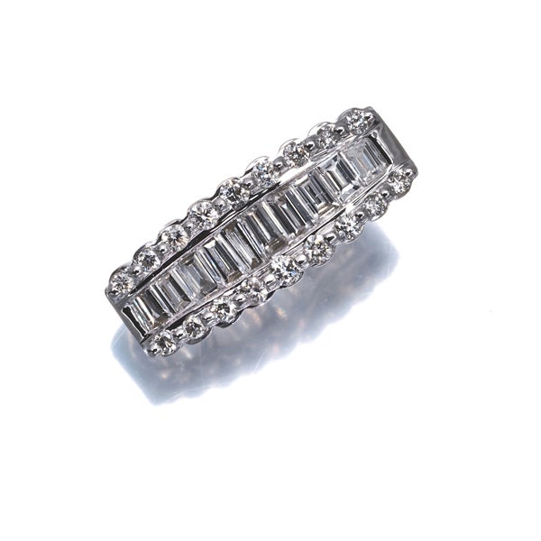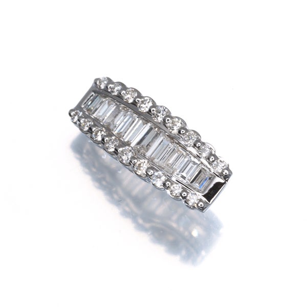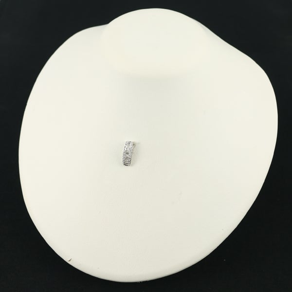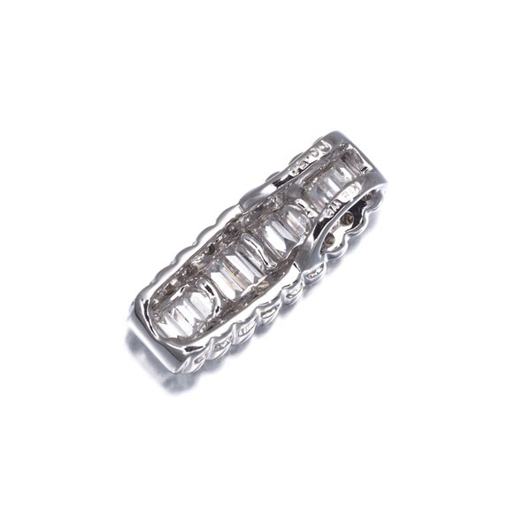 メインは色味を殆ど感じない上質な透明感を持ったバゲットカットのダイヤモンド。両脇に飾ったメレダイヤがシャープな印象を引き立てるペンダントトップです。