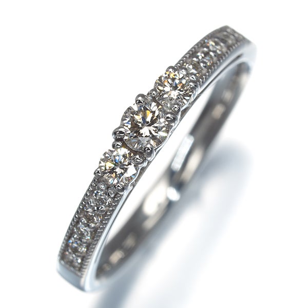 仄かなブラウンを纏った瑞々しいダイヤモンドの輝きが いつもの装いをいっそう上品に引き立てる素敵なリング。僅かな内包物しか見られない透明感溢れるお石をメインに テリの良い輝きがお手元を包み込みます。