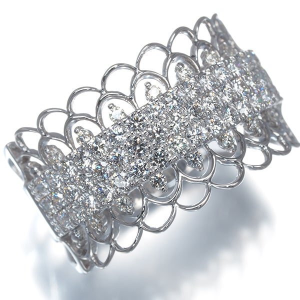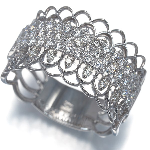 繊細なレース風デザインに、メレダイヤを贅沢に飾ったパヴェリング。上質なダイヤモンドをセレクトし、透明感のある輝きと美しい煌めきをお楽しみいただけます。細やかに敷き詰められたダイヤが光を受けて華やかに輝き、お手元を上品に彩りますよ。