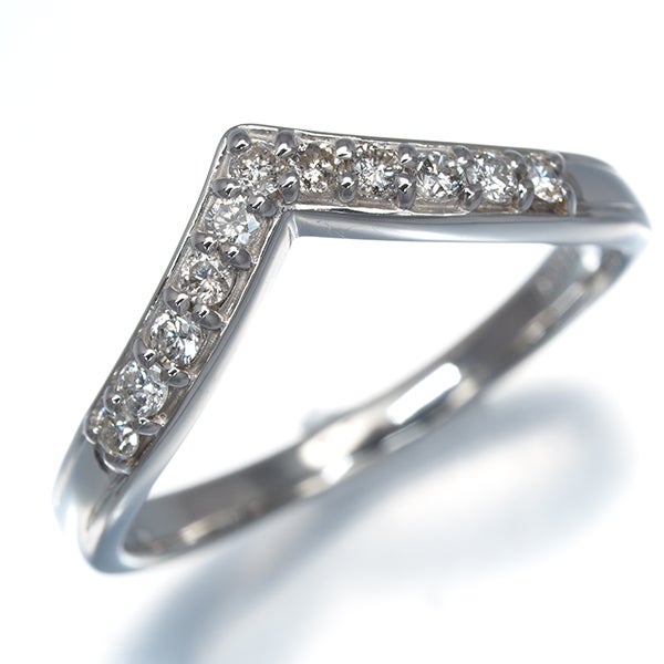 仄かなお色味を纏ったダイヤモンドの瑞々しい輝きをV字のデザインに飾ったプラチナリング。多少の内包物もお手元では感じさせない上品な輝きがお手元を飾ります。