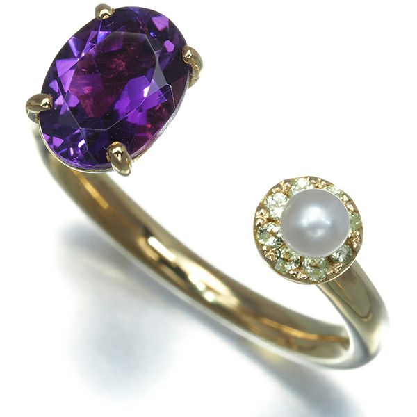 妖艶ささえ感じられる高貴な輝きが印象的なアメジストに ベビーパールの艶やかさが美しいコントラストを描いて飾られたハグリング。ペリドットの瑞々しい煌めきを添え お手元を華やかに輝かせてくれますよ。