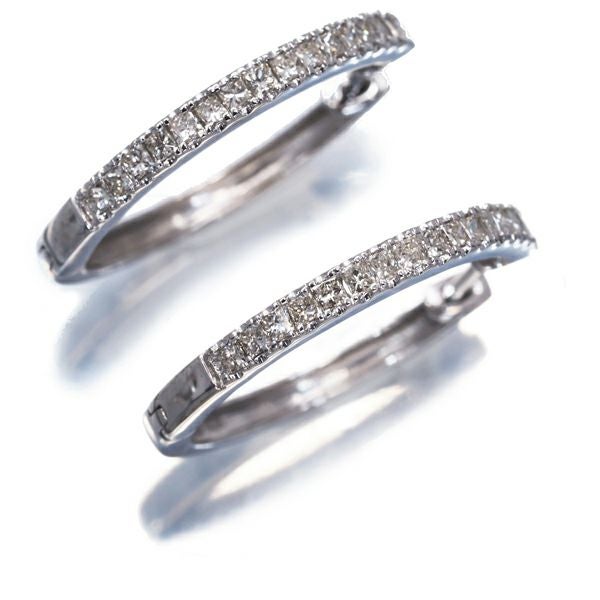 程よいボリュームを持つフープデザインへ上質な透明感を持つプリンセスカットダイヤモンドの眩い輝きを飾ったピアス。耳元をエレガントに演出するお品を是非どうぞ。