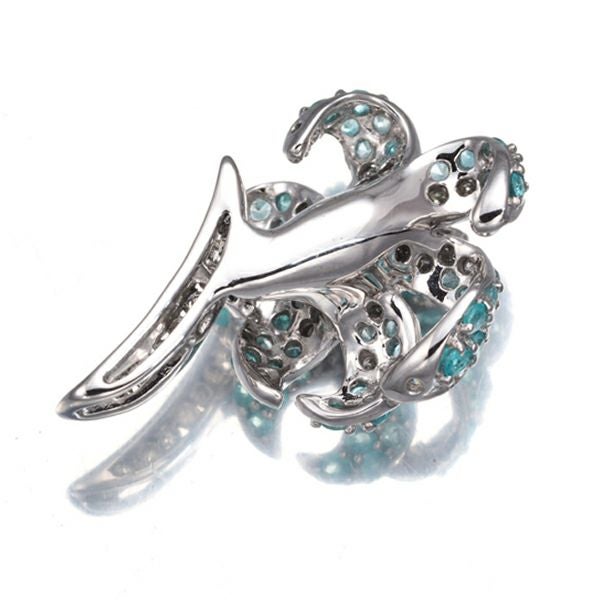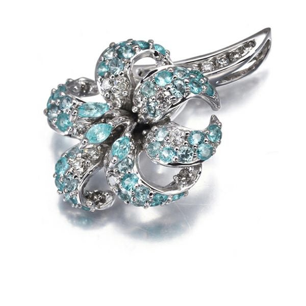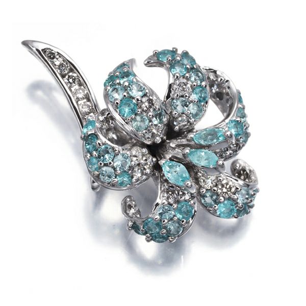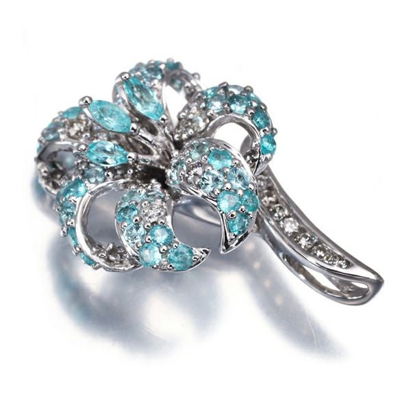 柔らかな雰囲気と立体的なデザインが実に美しいフラワージュエリー。繊細なダイヤモンドと共に飾られた上品なネオンの輝き美しいパライバトルマリンの優雅な煌めきが胸元を上品に演出することでしょう。