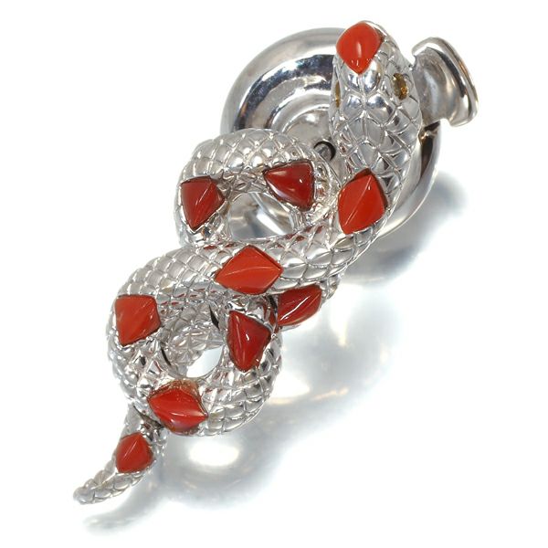 朱赤の珊瑚を模様にあしらった蛇のデザインブローチ。胸元に上品なアクセントを与えてくれますよ。