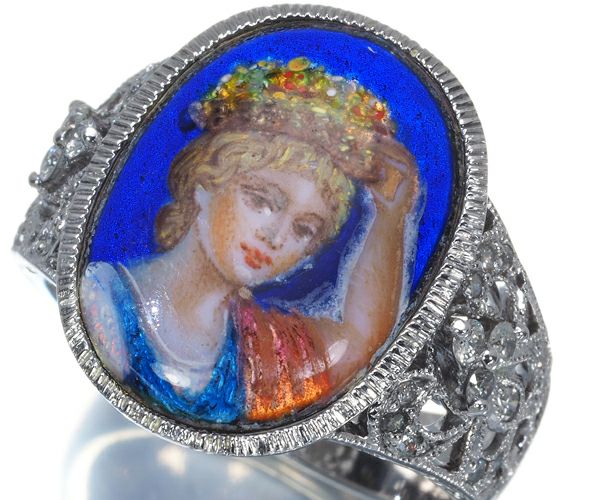 色鮮やかに女性が描かれたエマイユリングです。取り巻きにはダイヤモンドをミルグレインの繊細なデザインと共に飾っています。アンティーク調の美しいデザインが指元を印象的に演出します。